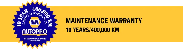 Under the NAPA AUTOPRO banner, we provide exceptional benefits such as the Peace of Mind Warranty and the 10/400 Maintenance Warranty. These warranties ensure top-quality service and peace of mind. Our Peace of Mind warranty offers 24 months or 40,000 km of worry-free protection on eligible work or repairs, valid anywhere in North America.